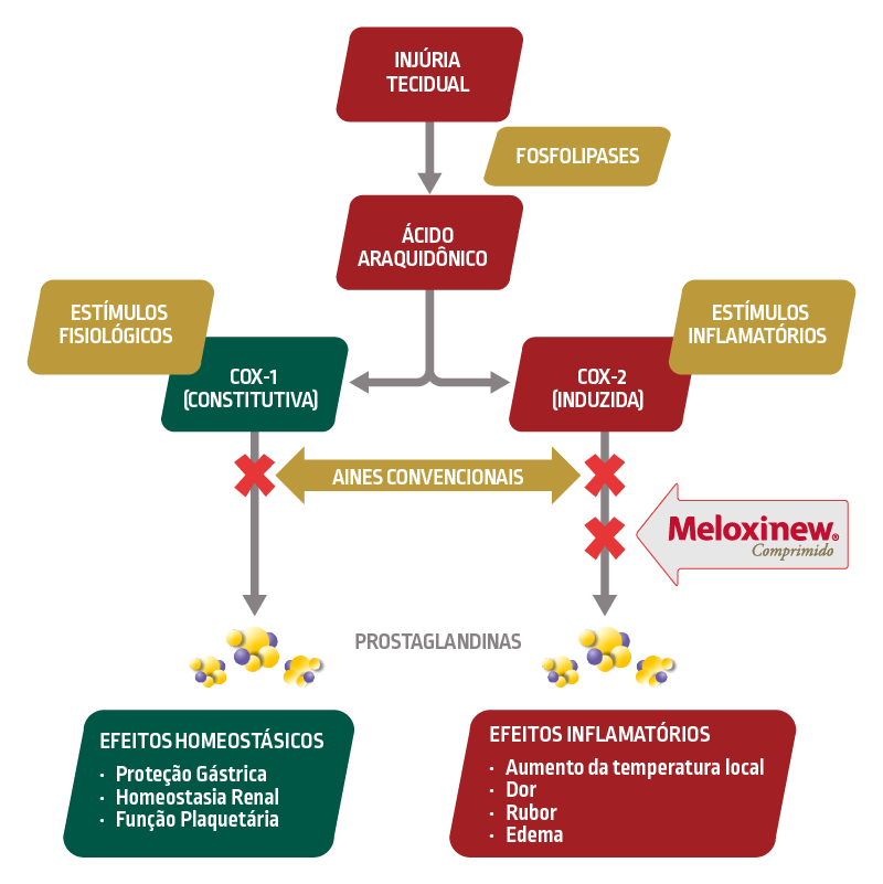 O principal mecanismo de ação do Meloxinew® Comprimido é a inibição preferencial da enzima Cicloxigenase 2 (COX-2) e consequentemente a capacidade de bloquear a biossíntese de prostaglandinas, mediadoras do processo inflamatório.